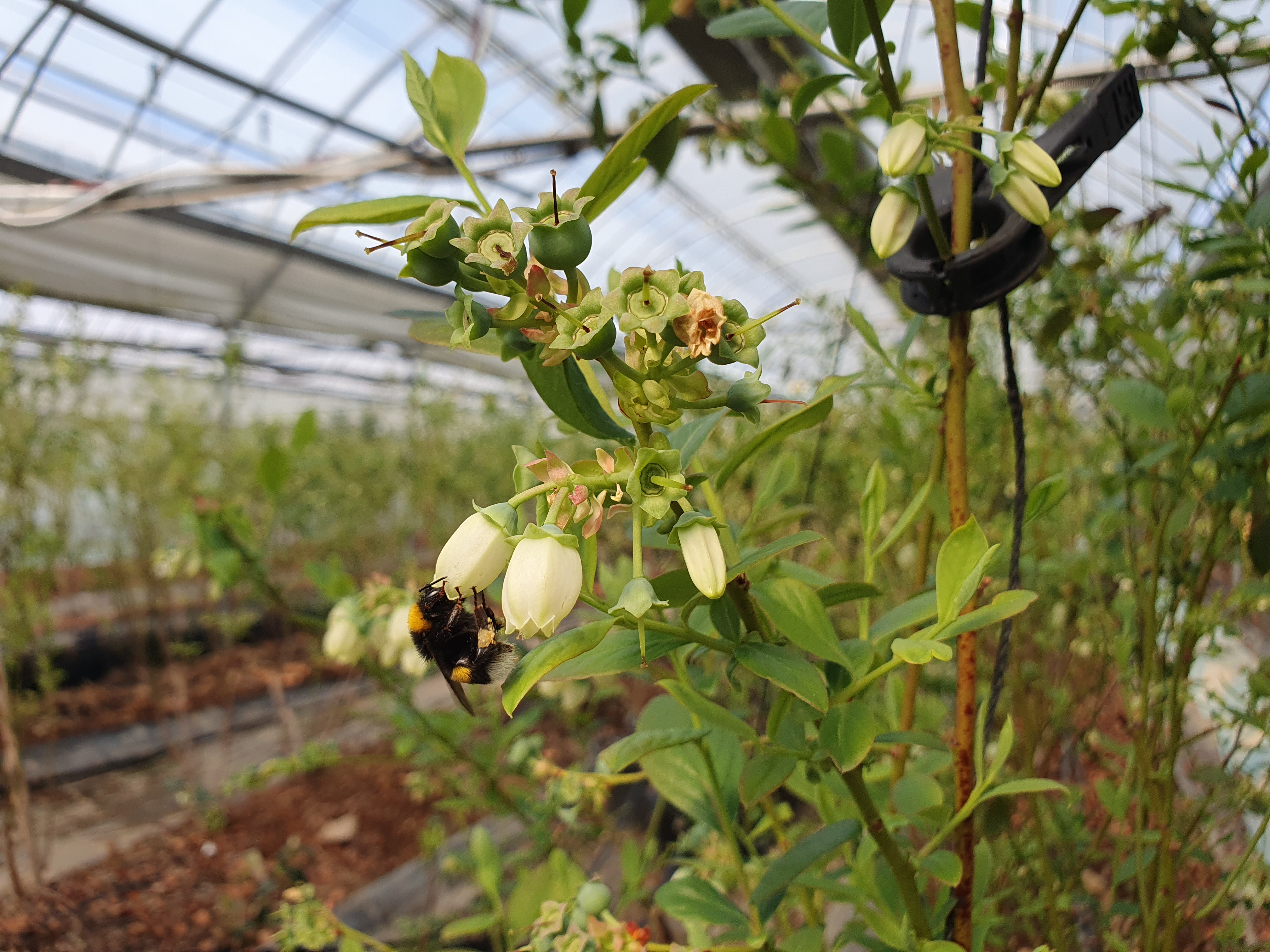 망고하우스에서 작업을 마치고 블루베리 하우스로 옮겨왔습니다. 지금 한창 벌들이 다니면서 수정을 하고 있는 시기네요. 여기저기서 벌들이 웅웅거리며 바쁘게 다니고 있습니다. 하얀 꽃잎이 있는 것은 아직 수정이 안된 거구요. 꽃잎이 떨어진 게 수정된 것입니다. 수정이 되면 시간이 지나면서 꽃받침 아래부분이 점점 커지는데요. 이게 두 달 정도 지나면 우리가 먹을 수 있는 잘 익은 블루베리가 됩니다. 여기에서는 제법 커진 열매들도 있으니 대략 4월 초순 정도부터 수확이 시작되겠네요.