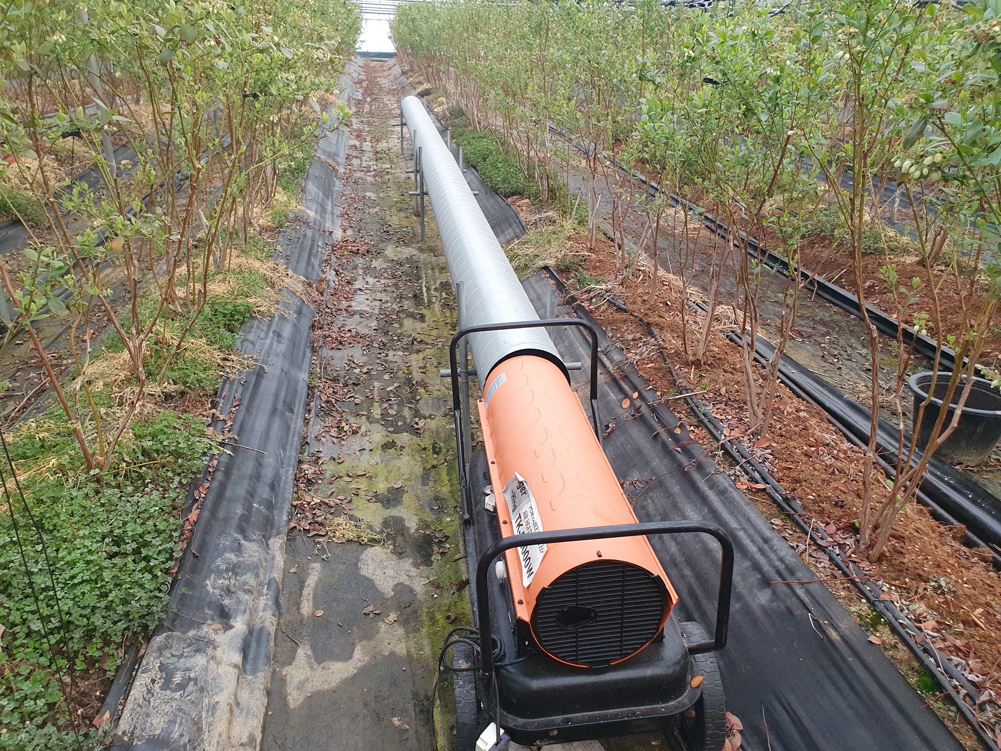 사실 겨울에 난방을 하면 하루종일 난방기가 돌아갈 거라고 생각하실 수 있겠지만, 난방기는 거의 밤에만 작동합니다. 바깥 날씨가 아무리 추워도 해만 뜨면, 낮에는 하우스 내부가 30도 정도는 가뿐히 올라가기 때문에 난방기는 작동하지 않아요. 블루베리의 경우 최저 온도를 10~12도 정도로 설정해 놓는데요. 아침 9시 정도면 하우스 온도가 그 이상 올라가기 때문에 난방기가 더 이상 작동하지 않습니다.
